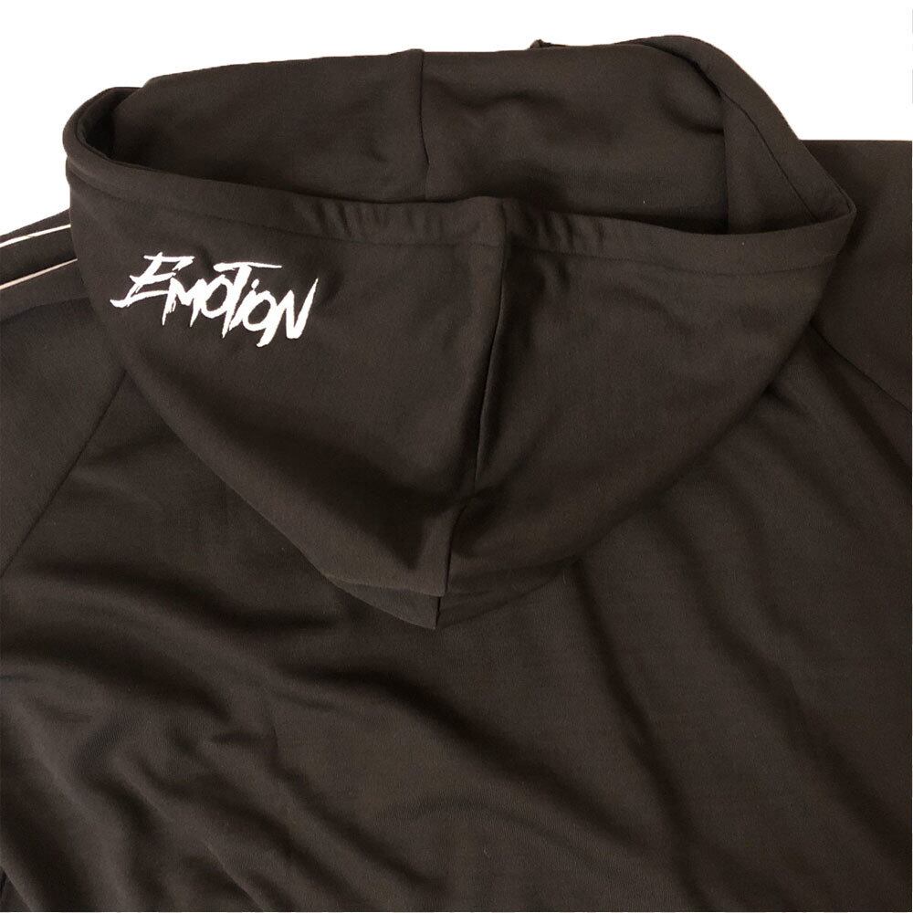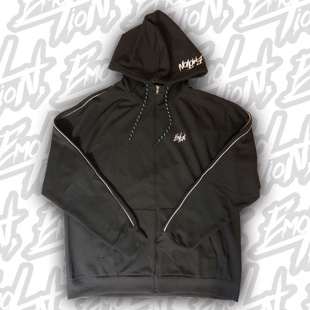 ジャージ素材を使用し、胸元左側とフード左側にそれぞれ異なったロゴを刺繍をあしらった、トラックパーカー(ジャージパーカー)。