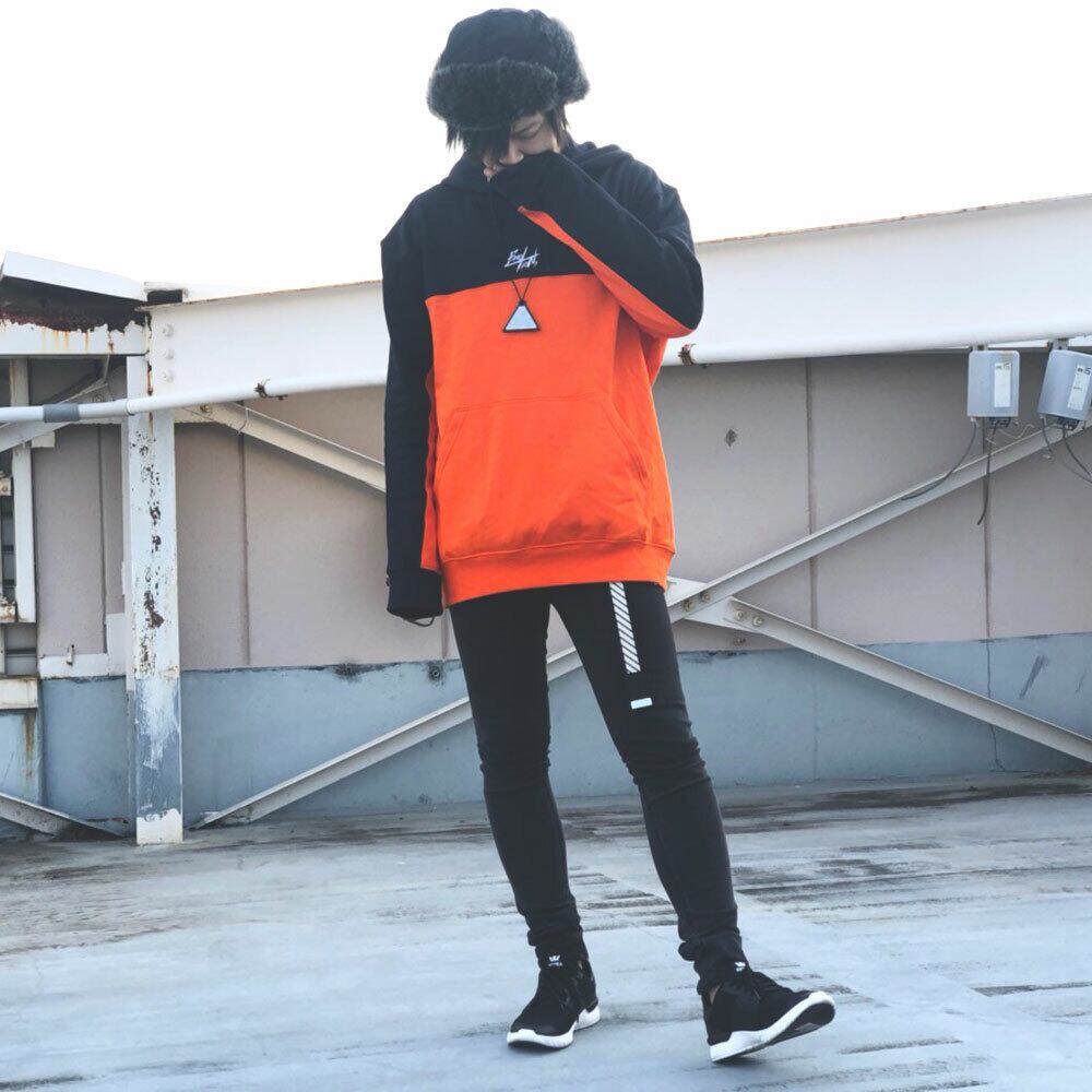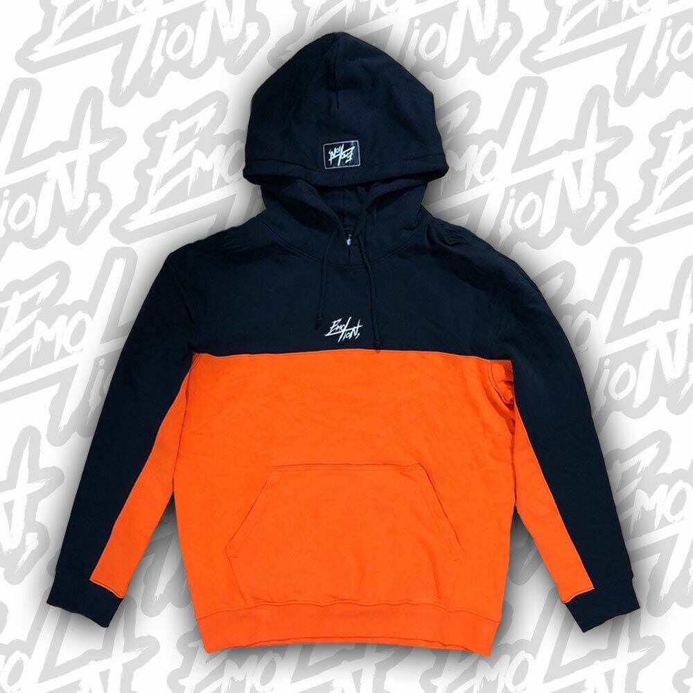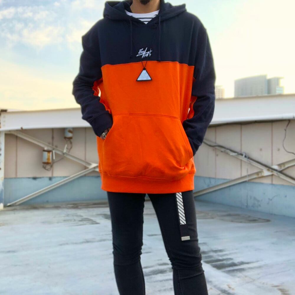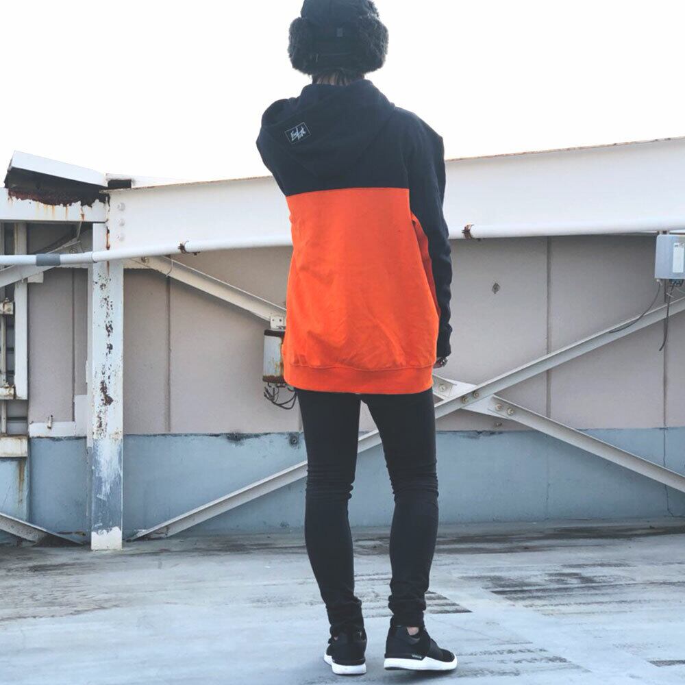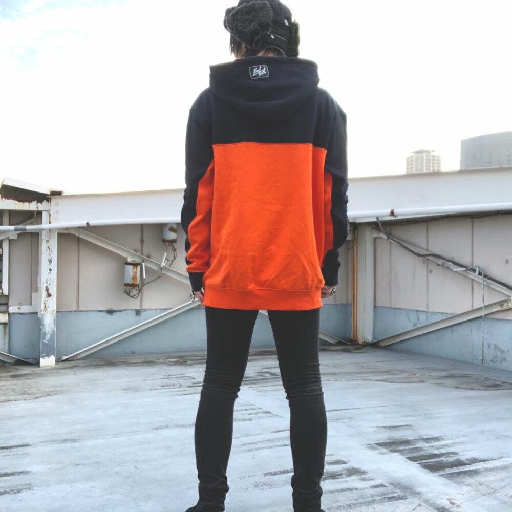 上下でオレンジとネイビーに切り替えたバイカラーのプルオーバータイプのフーディ。